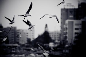 Cityscape with seagulls. Black and white photo with film grain effect
