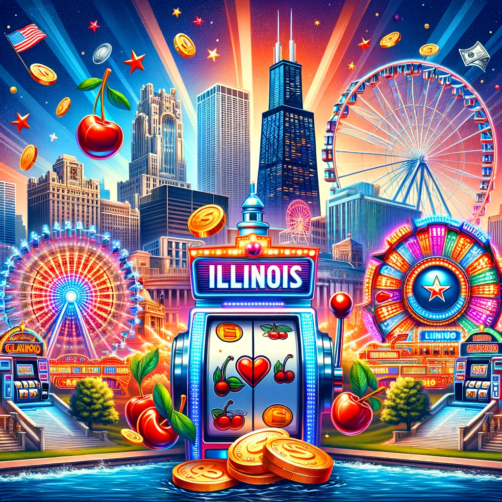 DALL·E 2024-02-23 23.22.18 – An engaging and colorful image representing the excitement of slot machine gaming in Illinois, USA. The scene is set against iconic Illinois landmarks